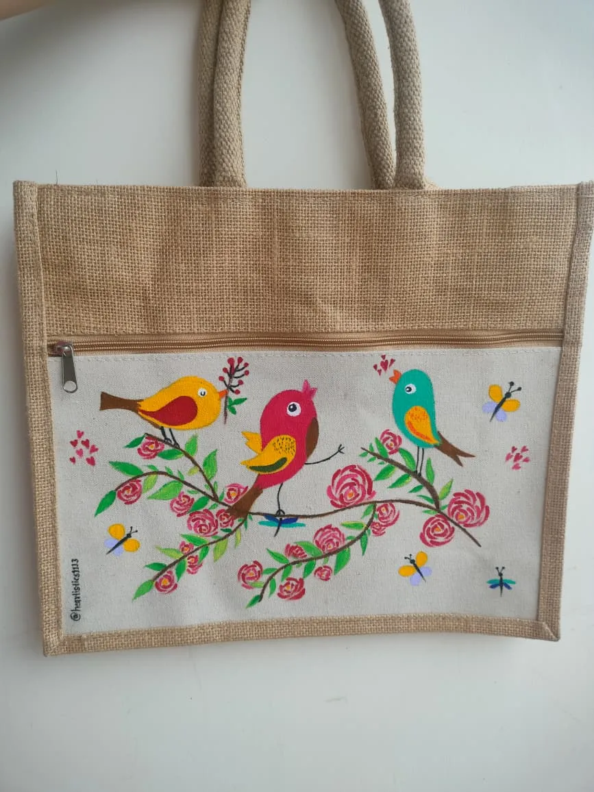 This eco-friendly jute bag is hand-painted by me with love, featuring vibrant birds perched on blooming branches. It adds a splash of color and artistry to your everyday style, blending traditional charm with a modern touch. Each piece is one-of-a-kind — thoughtfully crafted to make you stand out.